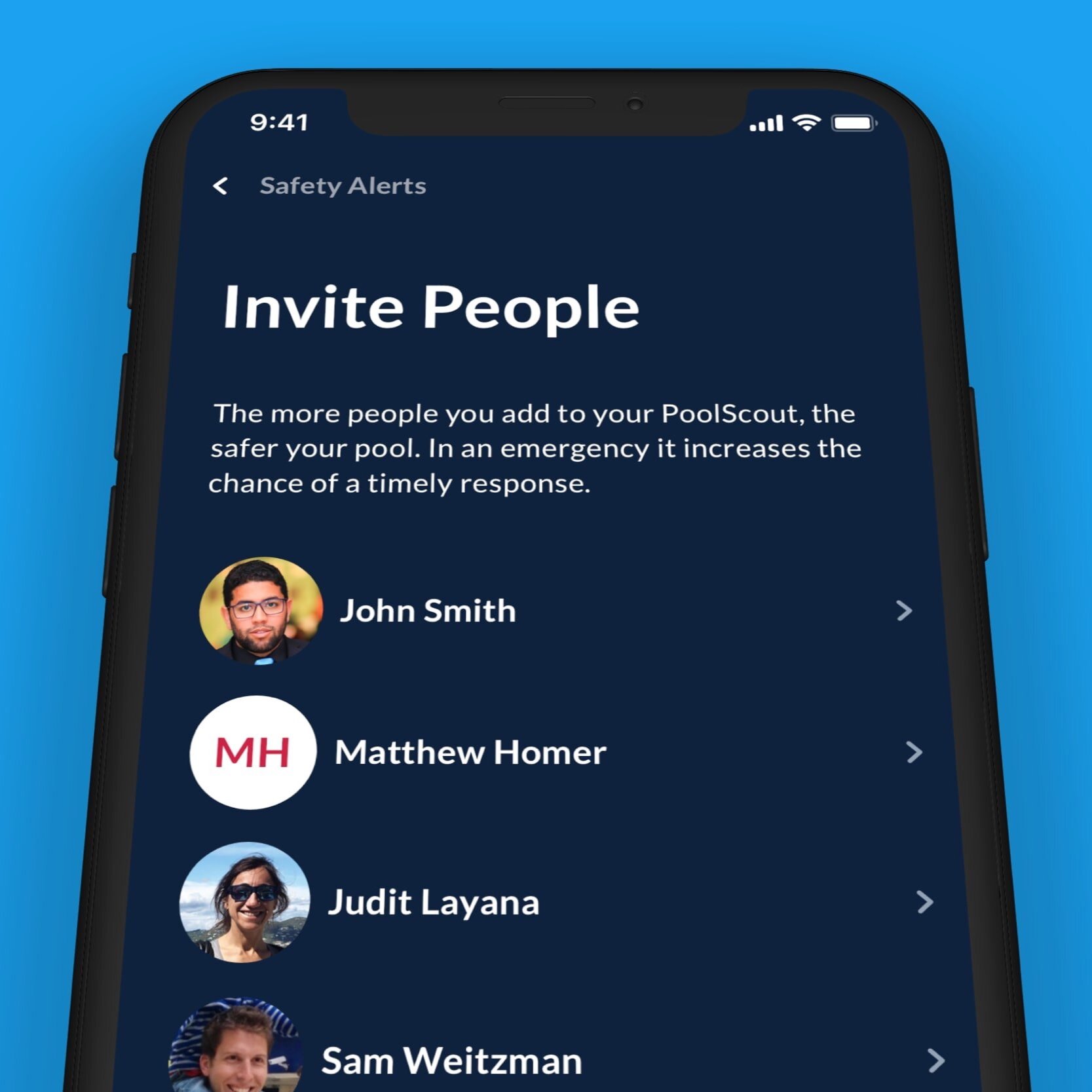 Adding more people to join your PoolScout account will increase your chance of a timely response in the case of an emergency. You will be able to customize permission and access levels for each user.